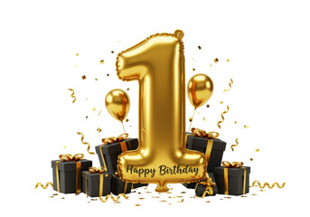 Isolated first birthday party theme with gifts and foil balloon number for celebration