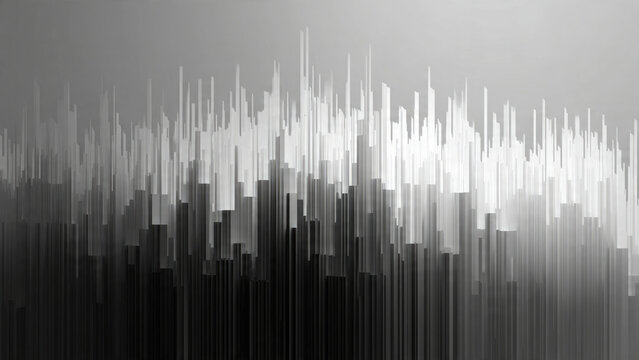 Abstract digital cityscape with varying vertical bars in a monochrome palette, transitioning from dark to bright, creating a dynamic visual rhythm.