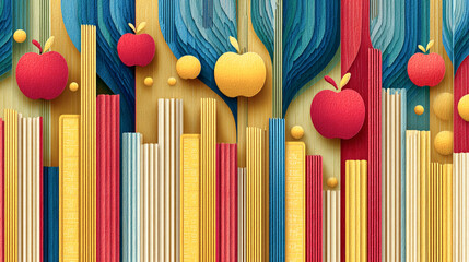 Colorful abstract 3d composition with apples, vertical bars and flowing shapes