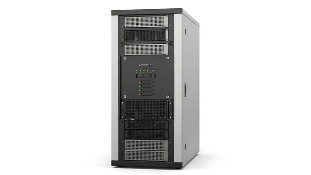 Central server rack with bundled cabling and control panel in led-lit high-density data center aisle