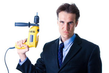Workers perform maintenance on a high voltage transmission tower against a clear blue sky.