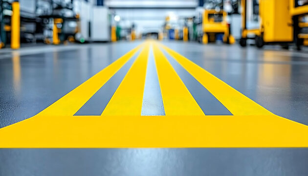 Yellow safety lines on a factory floor, guiding movement in a busy work environment, emphasizing clarity and order in industrial design.