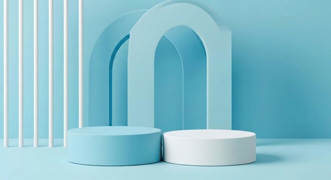Twotiered display podiums with arched backdrop and vertical white elements