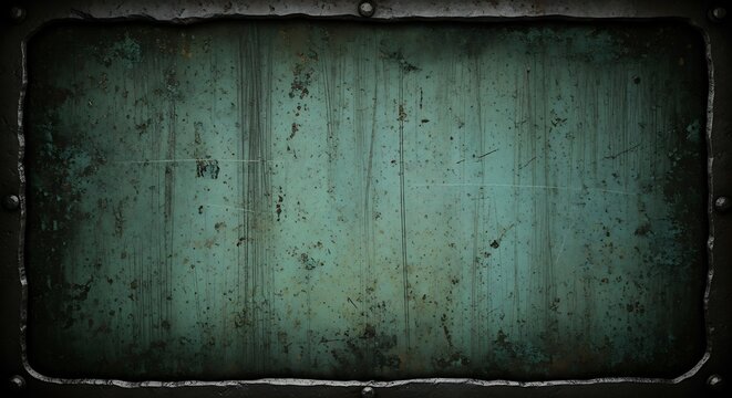 A weathered textured dark teal metal surface with visible vertical grain and distressed imperfections framed by a rough dark border
