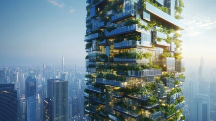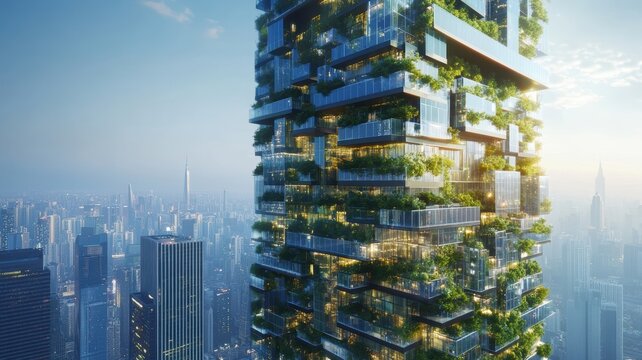 Sustainable eco-urban skyscraper with solar panels and vertical gardens integrating nature and modern architecture.