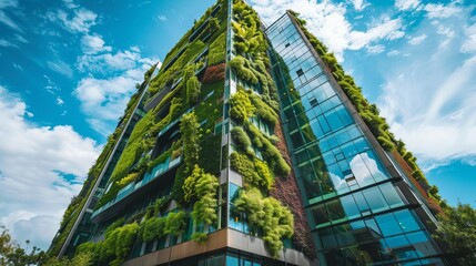 Modern green architecture with vertical gardens and glass walls viewed from below towards blue sky.