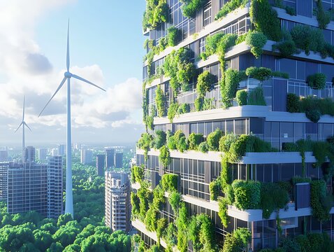 sustainable city building with wind turbines and vertical gardens