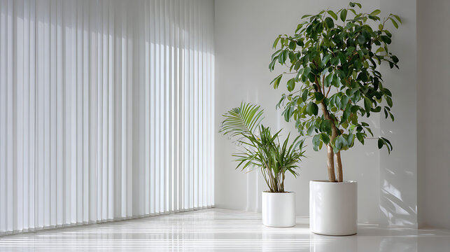 Lush green potted plants in a bright white minimalist interior with vertical blinds image