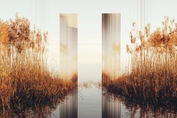 Glowing celestial rings emitting vertical light streaks over twilight sky, futuristic portal halos