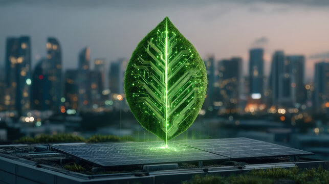Green leaf circuit hologram above solar panel on rooftop city skyline at dusk conveying renewable energy innovation and sustainability