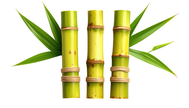 Three erect, segmented green stalks stand tall, interspersed with broad, green leaves. The cylindrical stems feature brown nodes