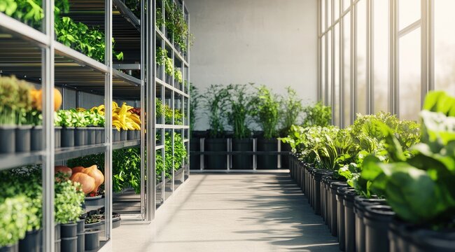 Modern indoor vertical farm with diverse plants