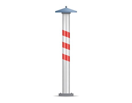 Isolated bowling pin standing tall, featuring white base with bold red stripes, set against a neutral gray background