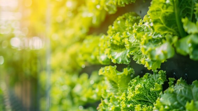 Closeup of a vertical hydroponic tower filled with rows of vibrant green lettuce plants growing without soil. .