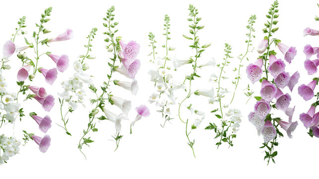 Vertical rows of foxglove flowers, colorful foxglove flowers, arranged vertically and hanging, the beauty of vertical foxglove flowers, foxglove flowers of different colors, on a transparent backgroun