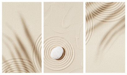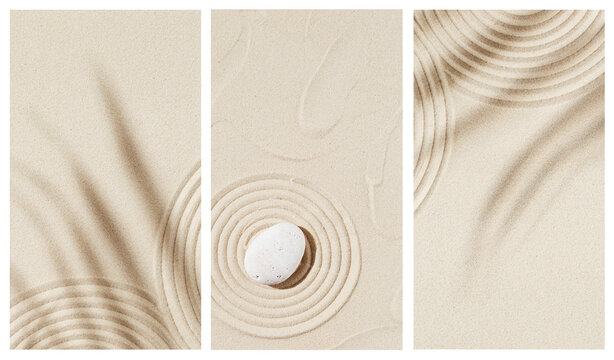 Zen garden meditation sandy background for relaxation. Lines drawing in sand and shadows of palm leaves