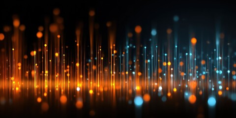 Abstract glowing orange and blue light streams rise against dark background.