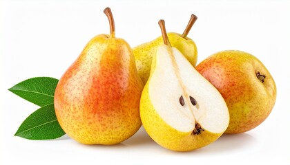 Three pears including two whole and one sliced vertically showing seeds and creamy interior against white background for culinary educational and natural product visuals