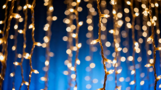 Strings of warm white fairy lights hanging vertically against a blue background, creating a bokeh effect with soft glowing orbs.