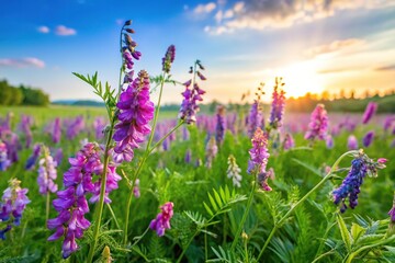 Flowering meadow with purple flowers vetch