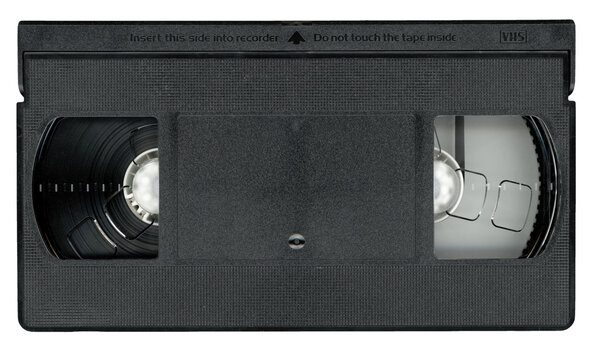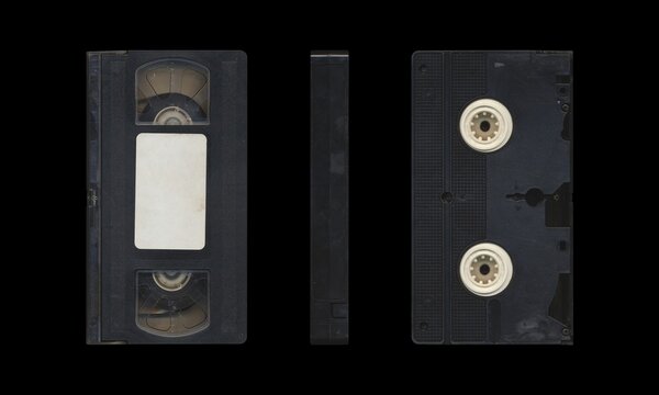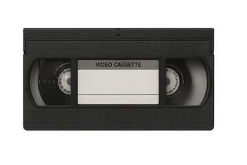 Single old vintage black blank VHS video cassette isolated on white, back side. Retro technology, vcr, outdated obsolete vhs tape, tech items from the 80s and 90s. One videotape on white, hq closeup