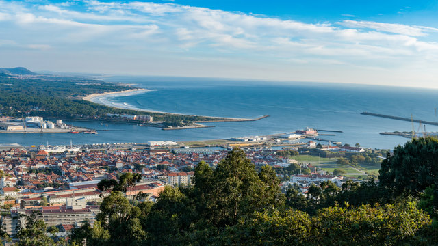 Scenic view of the Viana do Castelo with overlooking city buildings and the blue ocean during sunset