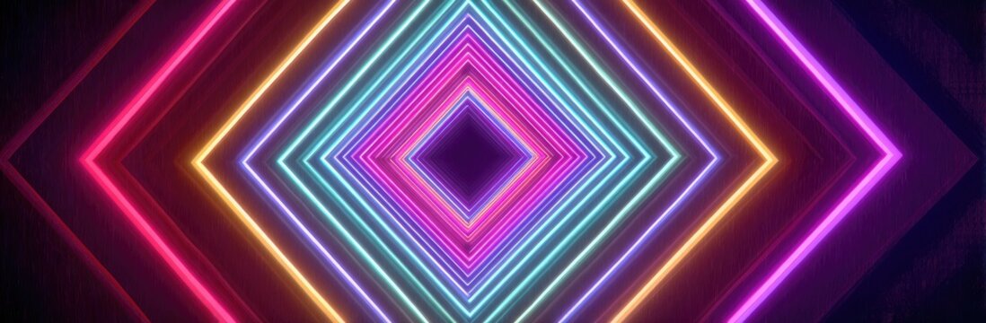 Vibrant 3d neon light tunnel with geometric pattern