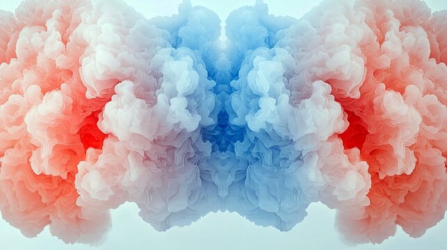 A symmetrical abstract formation of red and blue smoke or clouds, suggesting a dynamic collision or blend of elements.