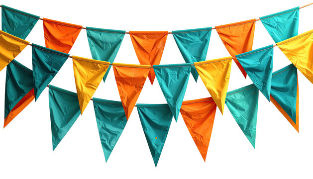 Colorful bunting garland featuring teal, orange, and yellow triangular flags against a black background