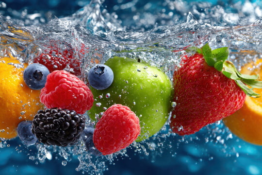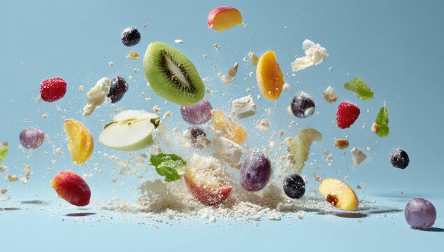 Four rows of colorful fruits and vegetables, seemingly suspended in mid-air,  displaying vibrant hues and dynamic motion