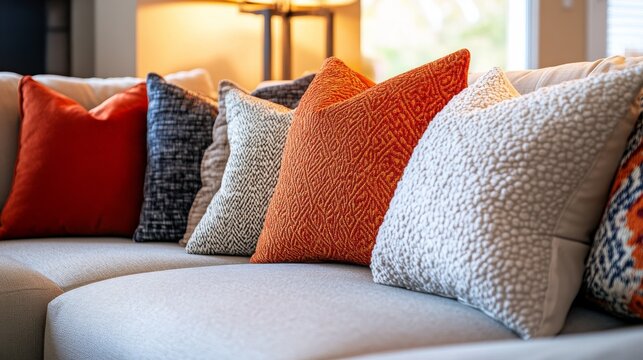 This sectional sofa showcases a variety of soft, colorful pillows in multiple fabrics, enhancing the warmth and charm of the inviting living space