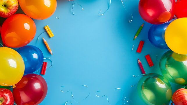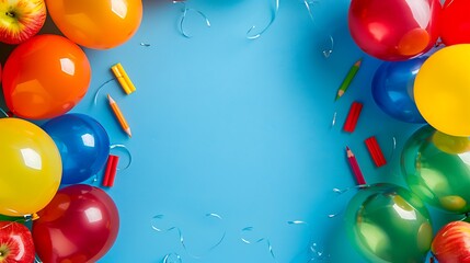 Brightly colored balloons featuring pencils and apples on both sides leaving space for school announcements ideal for festive classroom decorations or back to school event design templates