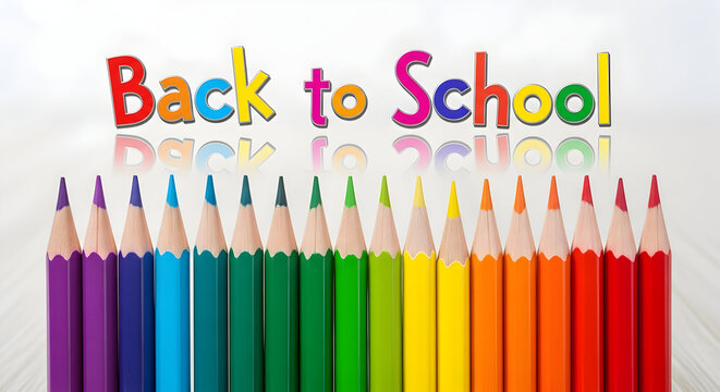 Colorful pencils arranged in a rainbow spectrum underneath a vibrant back to school message
