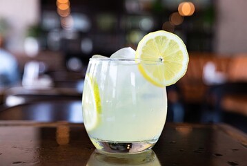 Bright refreshing lemonade with ice and lemon slices on a dark bar table
