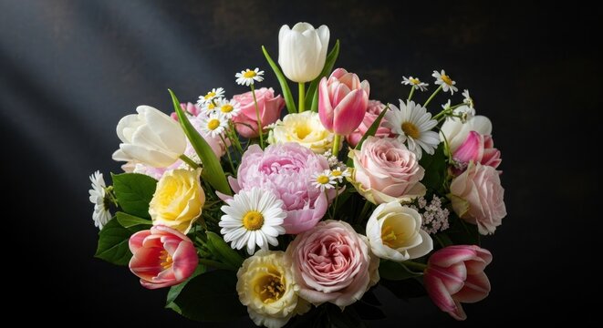 A vibrant bouquet of pink, white, and yellow flowers, including tulips, roses, and daisies, arranged in a vase against a dark background.