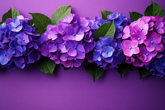 Vibrant hydrangea flowers in shades of purple and pink with green leaves arranged on a matching purple background, creating a harmonious and fresh floral display