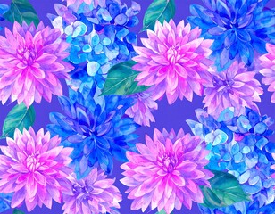 Vibrant floral pattern with pink and blue dahlias and hydrangeas on a purple background