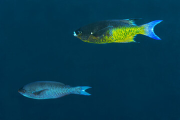 Two tropical fish swimming in the deep blue ocean