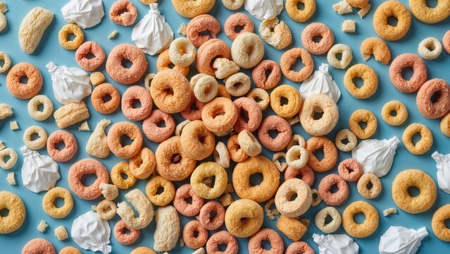 A playful colorful breakfast: cereal loops in a bowl some floating mid-air against a blue background Fun and tasty treat!