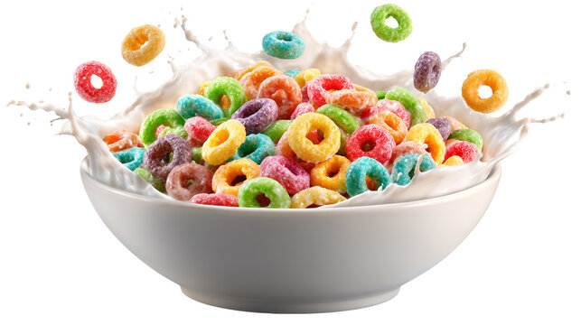 Cereals, fruit loops, milk pouring into a bowl, colorful background , vibrant colors, playful, breakfast enjoyment,  energy boost, childhood nostalgia