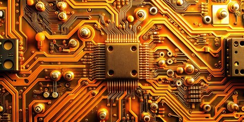 Electronic circuit board with vibrant orange gear components and metallic wiring , industrial equipment, circuit board