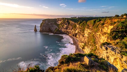 Stunning coastal scene with dramatic cliffs, a solitary rock formation, and vibrant sunset colors