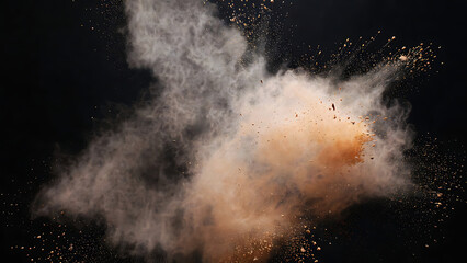 Dramatic explosion of orange powder on dark background with smoke