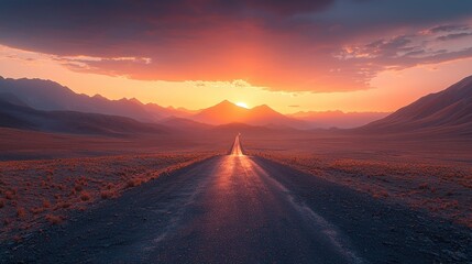 A paved road stretches into a vibrant sunset over a mountainous desert landscape.  Vast, colorful sky with dramatic clouds