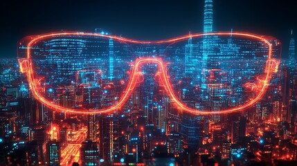 Futuristic Augmented Reality Glasses Displaying Digital Elements Over a Cityscape with Blurred Background