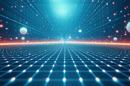Futuristic digital grid and glowing spheres in a virtual reality space