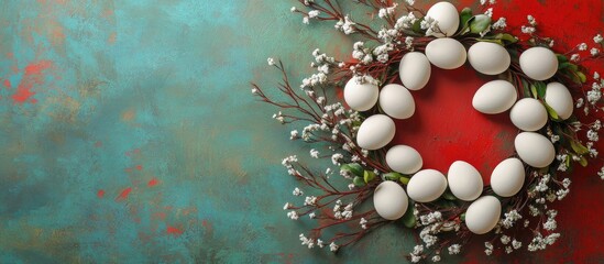 Easter holiday backdrop with decorative copper and quail eggs on a textured turquoise background featuring ample copy space for text