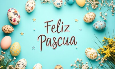 Decorative Easter eggs and flowers surrounding 'Feliz Pascua' text on a turquoise background.