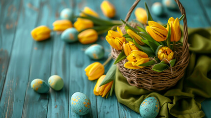 Easter joy: blossoms and bunnies. Top view shot of chocolate bunny, pink tulips, yellow mimosa flowers, speckled eggs, candy-filled egg shell on teal background with space for joyful Easter messages