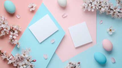 Easter card mockup with eggs, and blossoms, on a pastel pink and blue background.